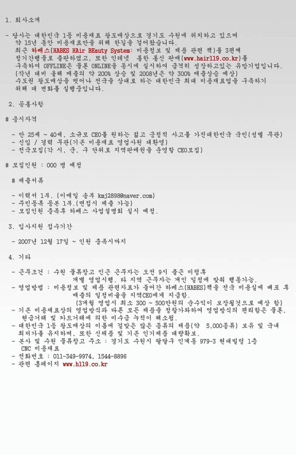 그리고 나서 연히 보게된 하베스 영업부 모집이라는 문구를 보고 나도 모르게 면접을 보게 되었다...