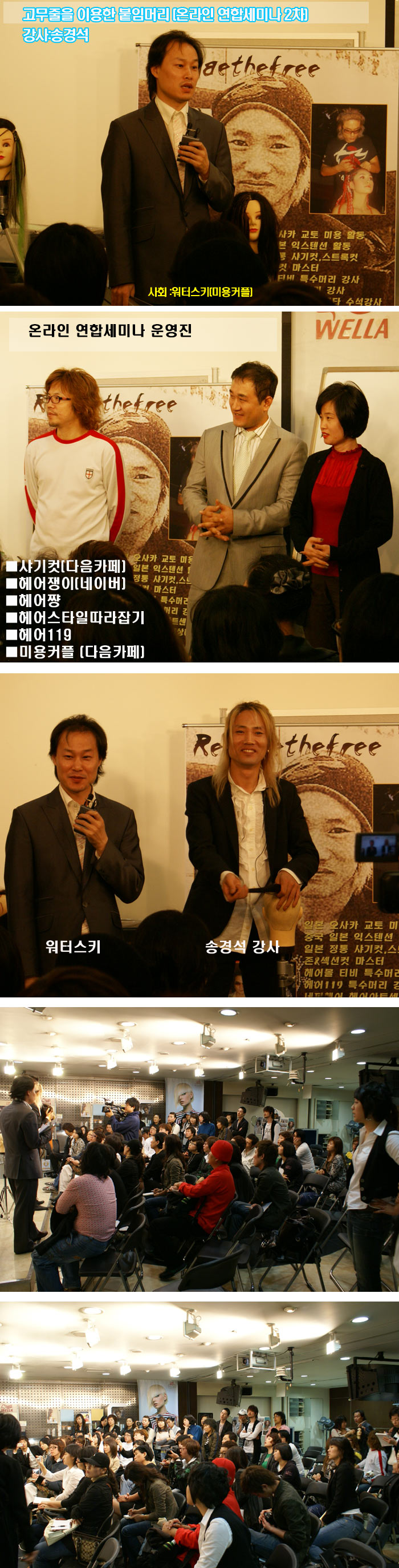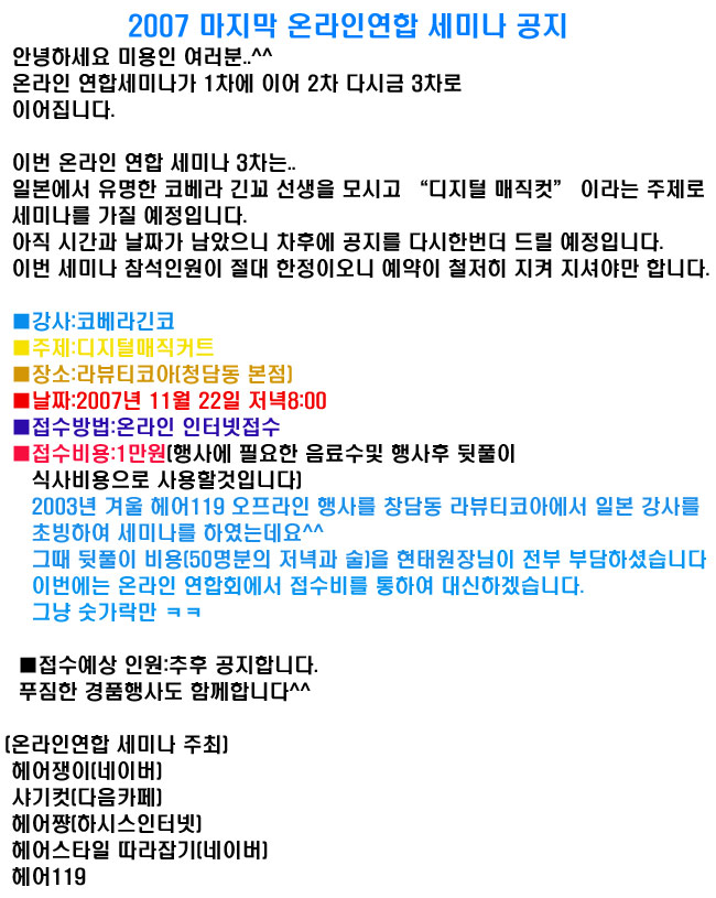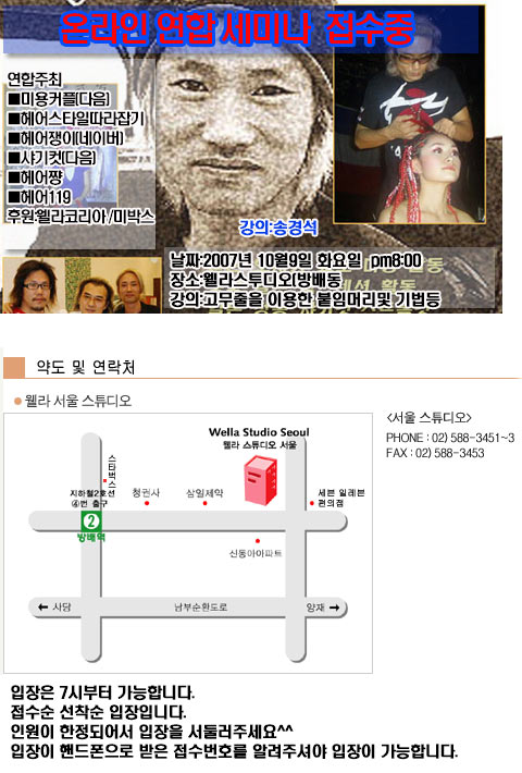 온라인연합회  |  2007년 10월9일 저녁 8시 서울 방배동 웰라스튜디오에서 실시하는 고무줄을 이용한 붙임머리기법 세미나는 내일 오전12시에 접수 마감 예정입니다.